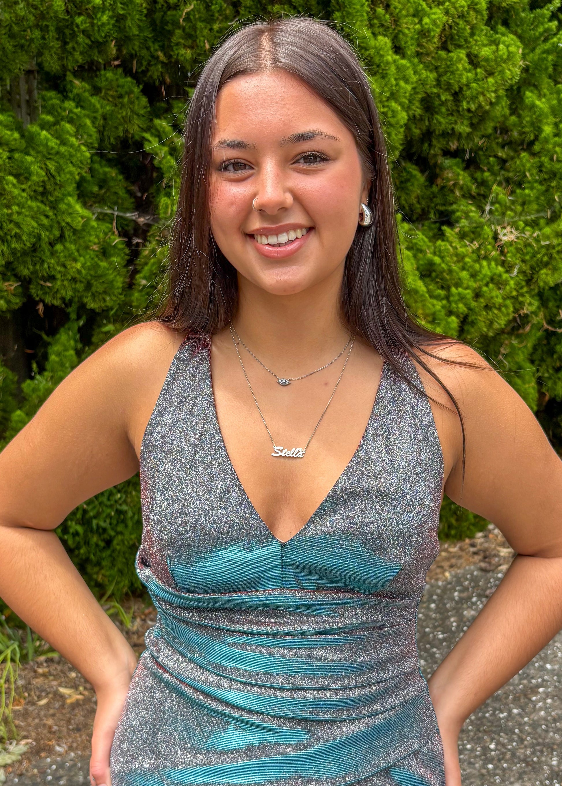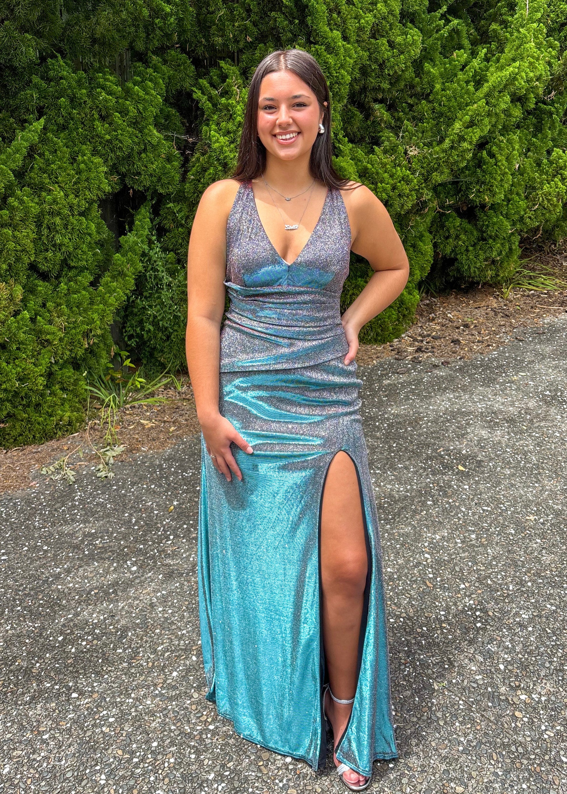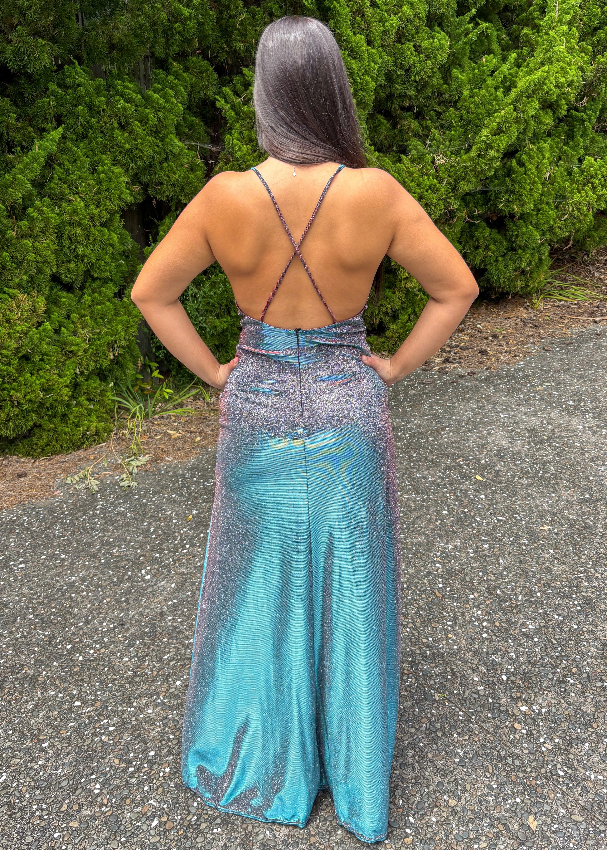 This unique shimmery ball dress flickers between hues of silver, green and red and is perfect for school balls, graduations or formal events!