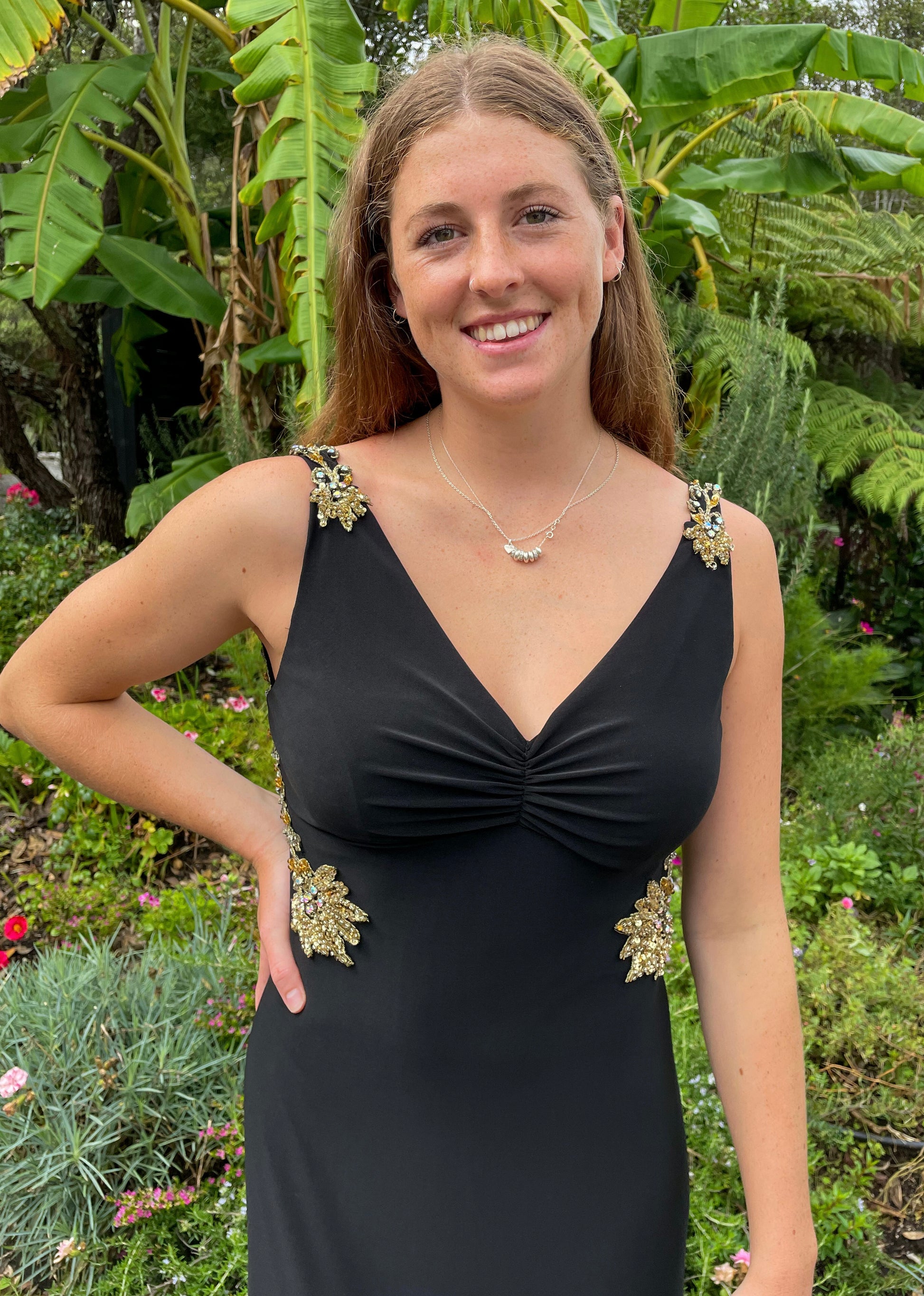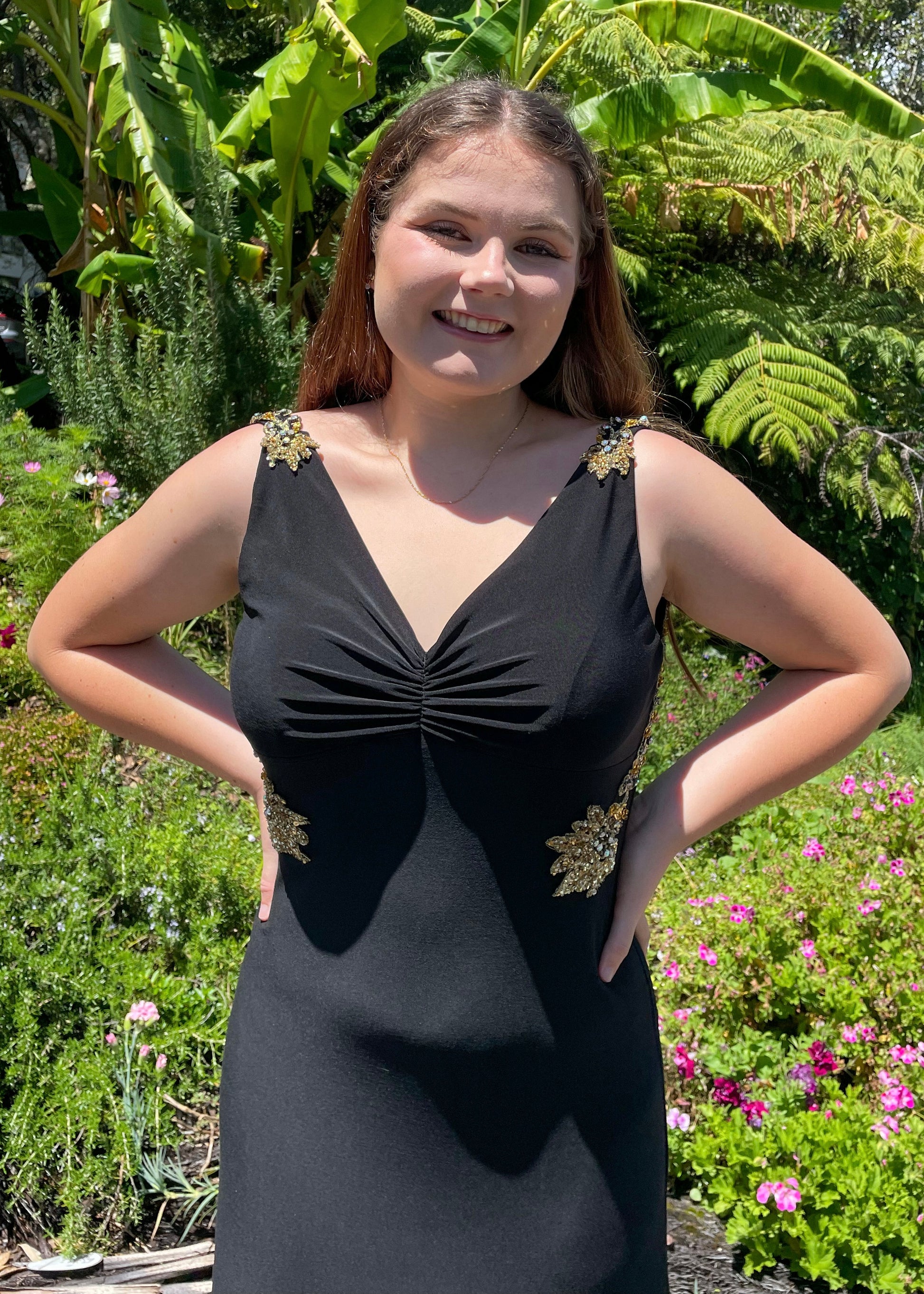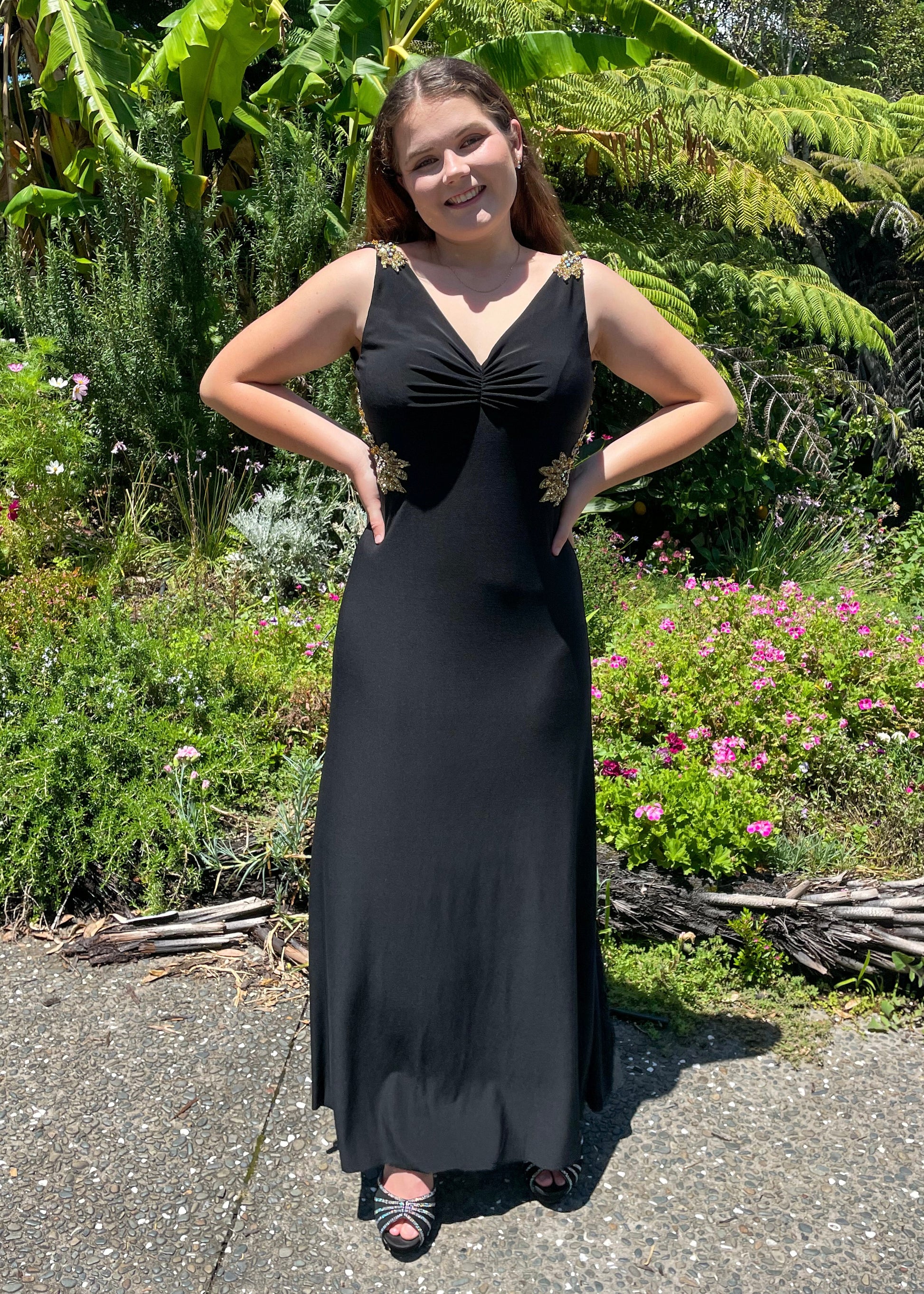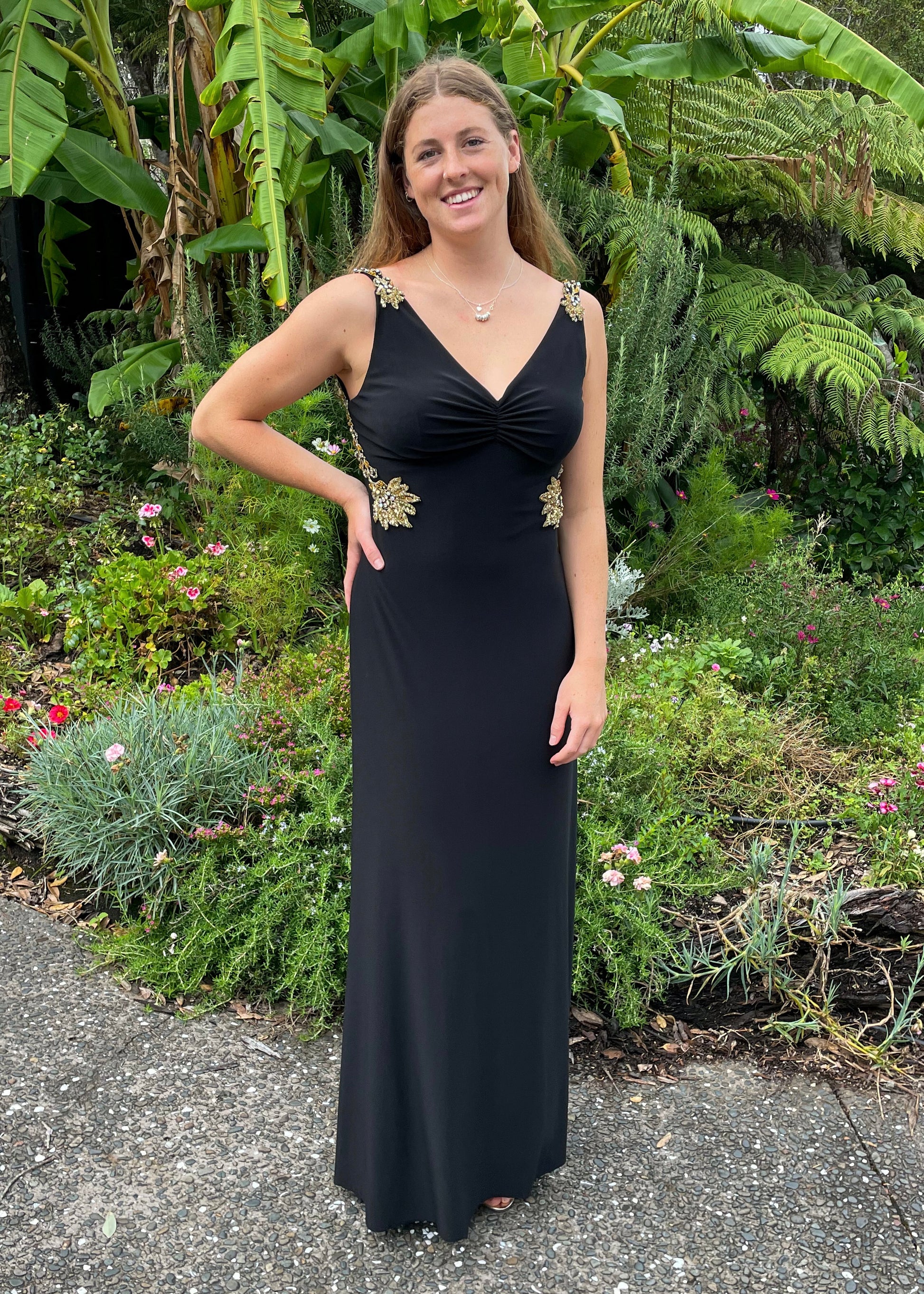 Command attention in this striking ball gown featuring a beautiful V-neckline, with accents of gold at the waist and shoulders. The fitted bodice flatters your figure, while the flowing skirt adds movement, ensuring you stand out from the crowd with confidence and poise.