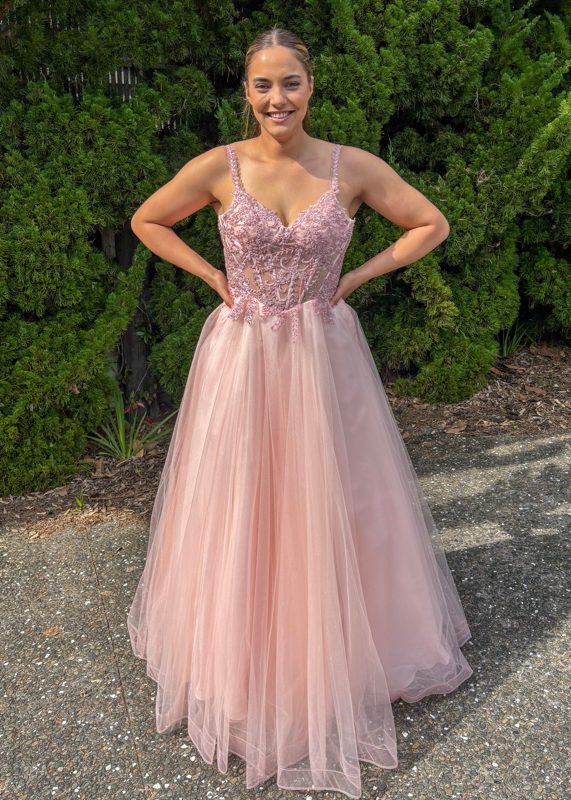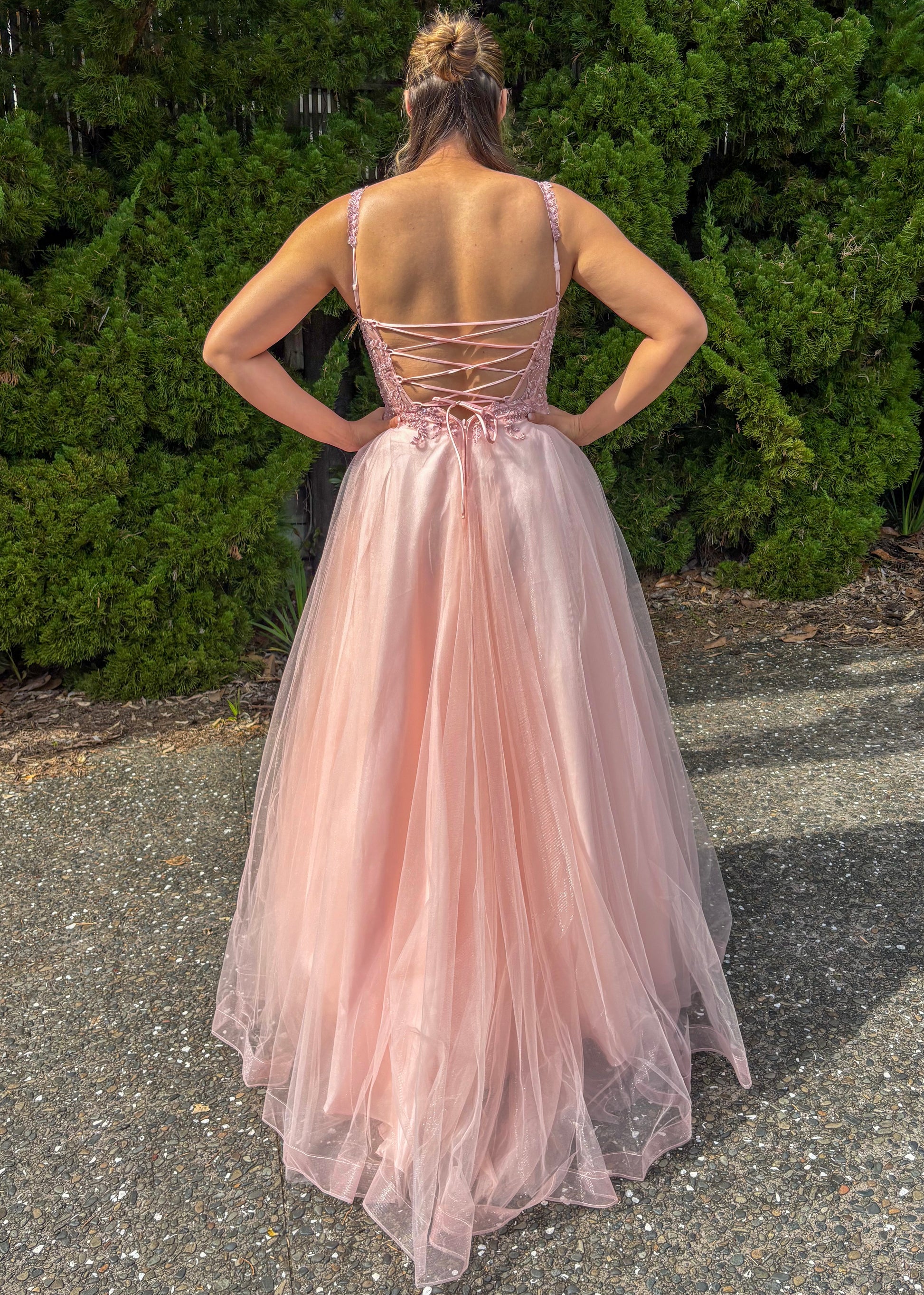 The perfect pink princess dress, featuring a floral corset, lace-up back and layers of tulle.