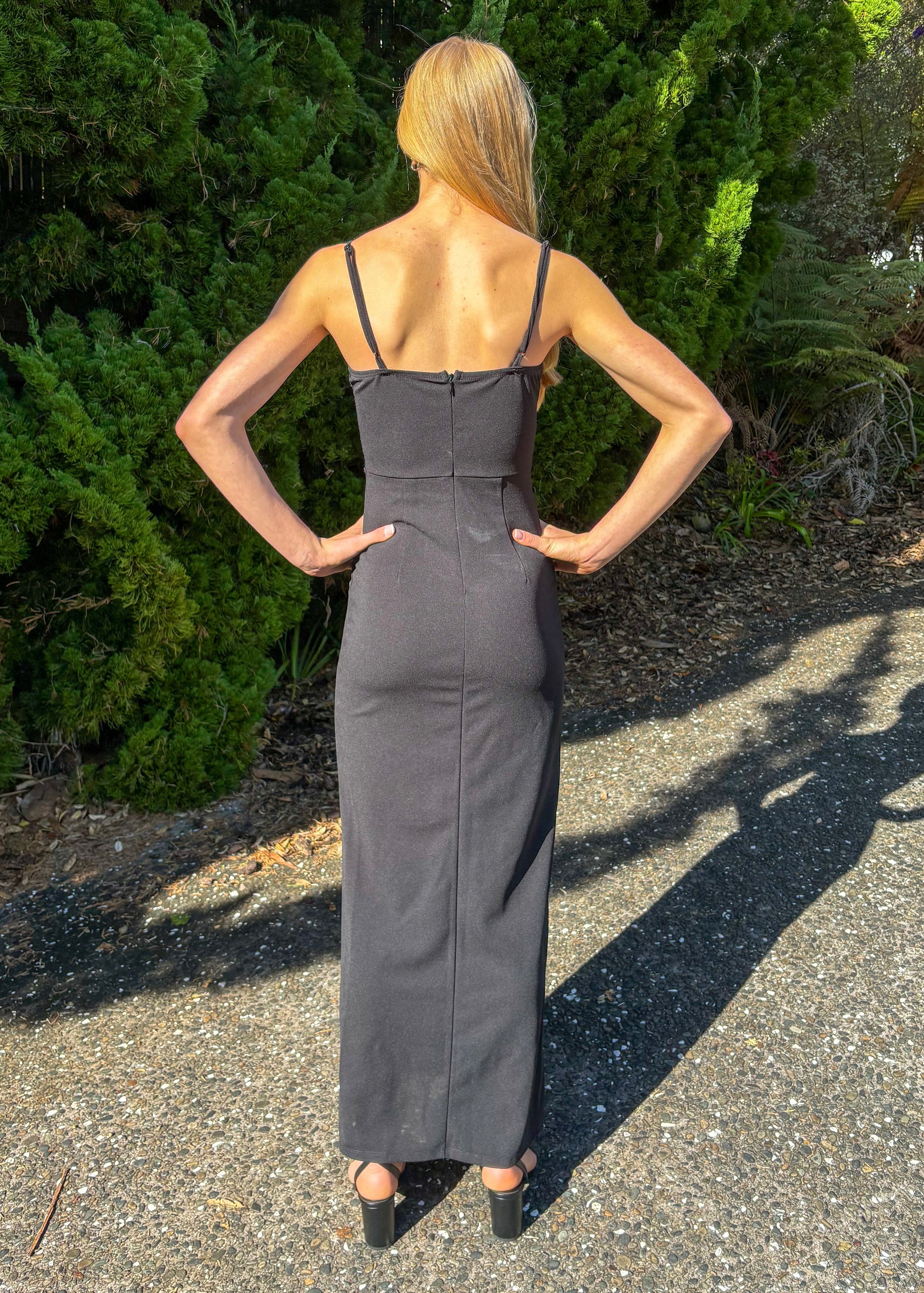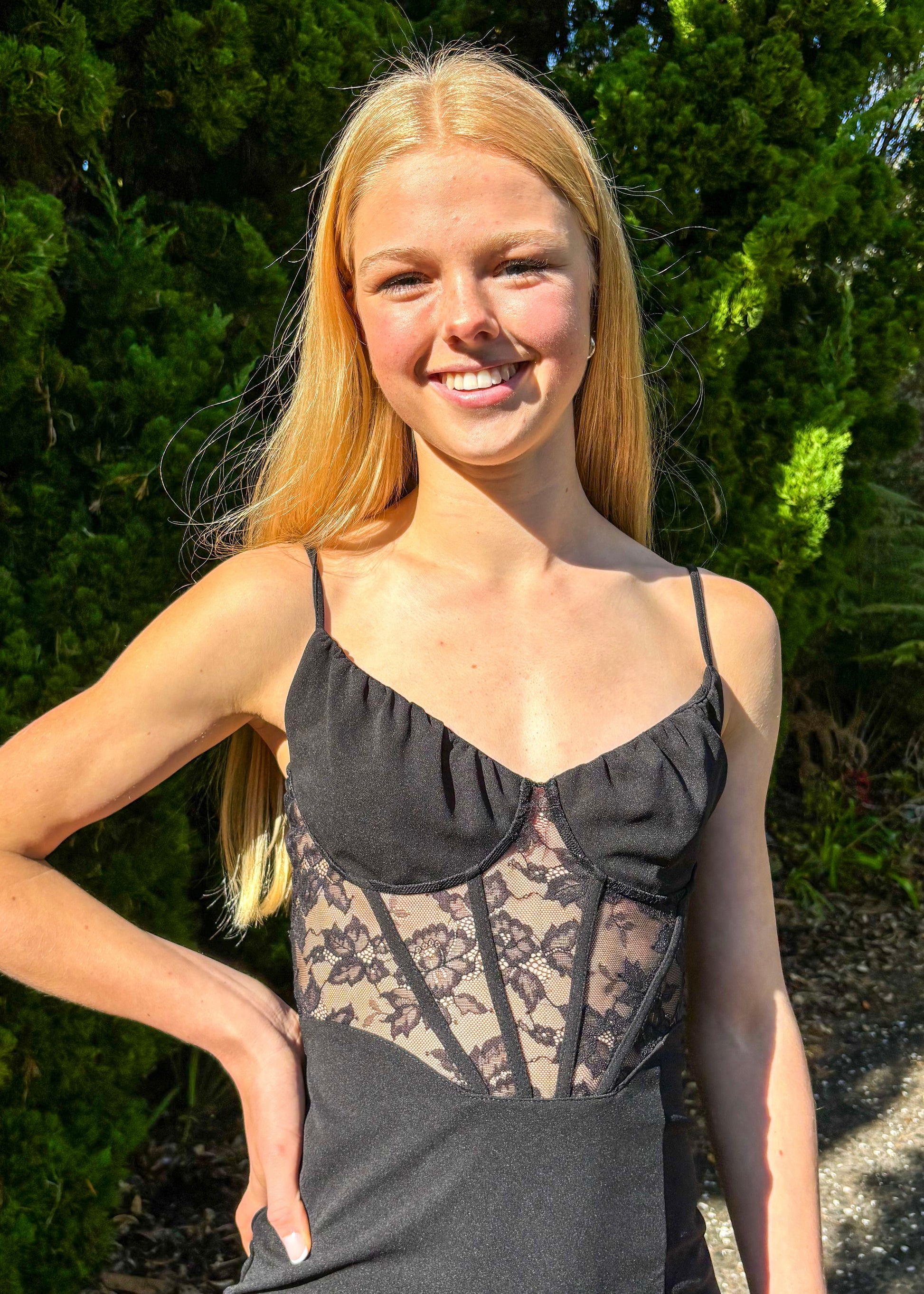 The ultimate little black dress… with lace corset panelling, high leg slit and elegant fit. Perfect for the ball!