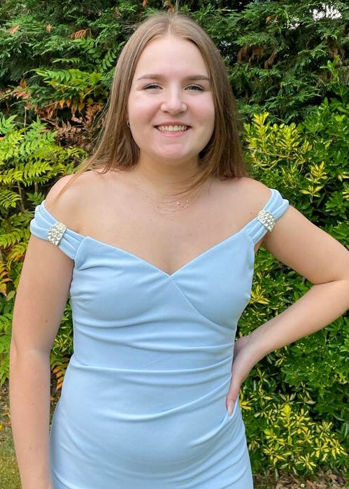Make a statement in this sleek baby blue dress featuring a v-neckline and off the shoulder look