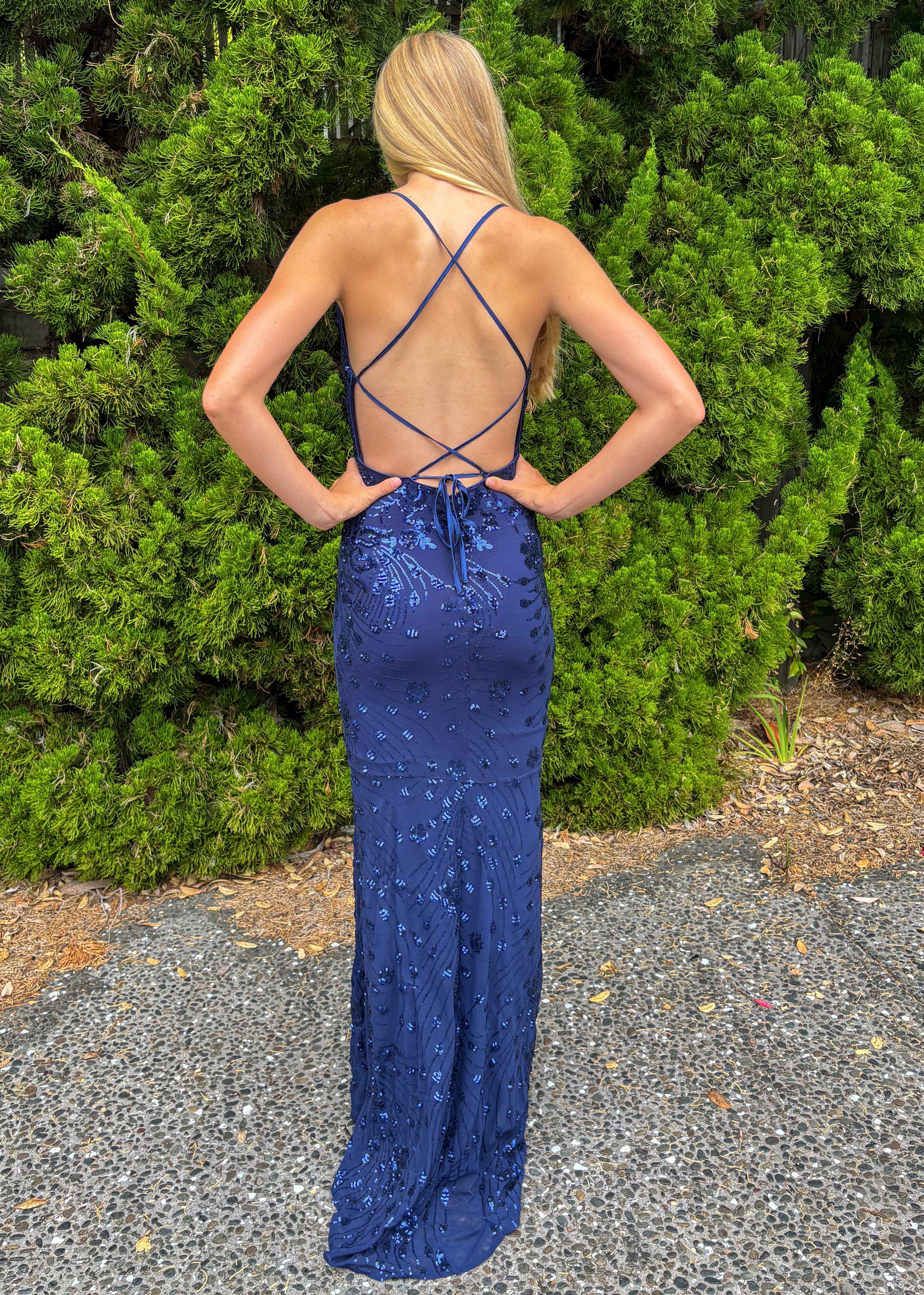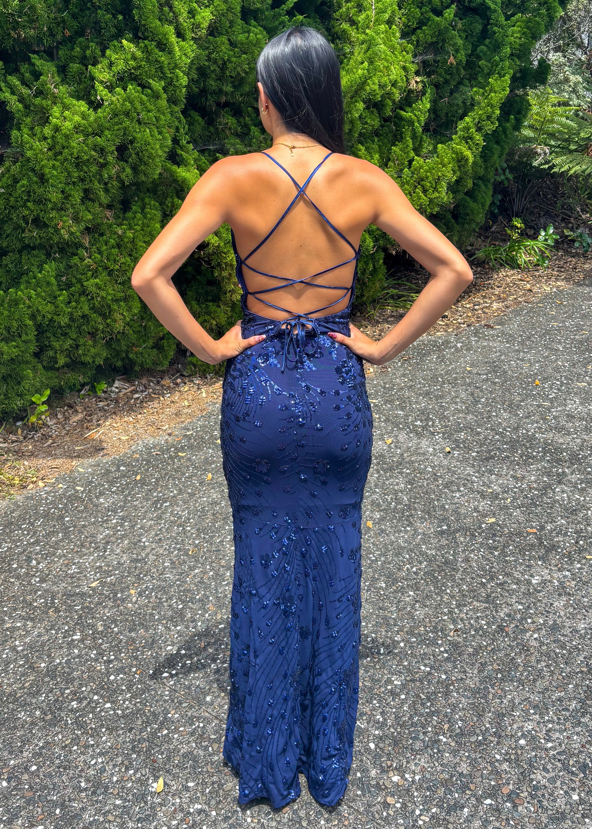 One of our most popular styles - turn heads in this navy blue ball dress, showcasing a deep V-neckline and floral sequins, with a lace-up back for a flattering, glamorous look. Find out more about our try-on options.