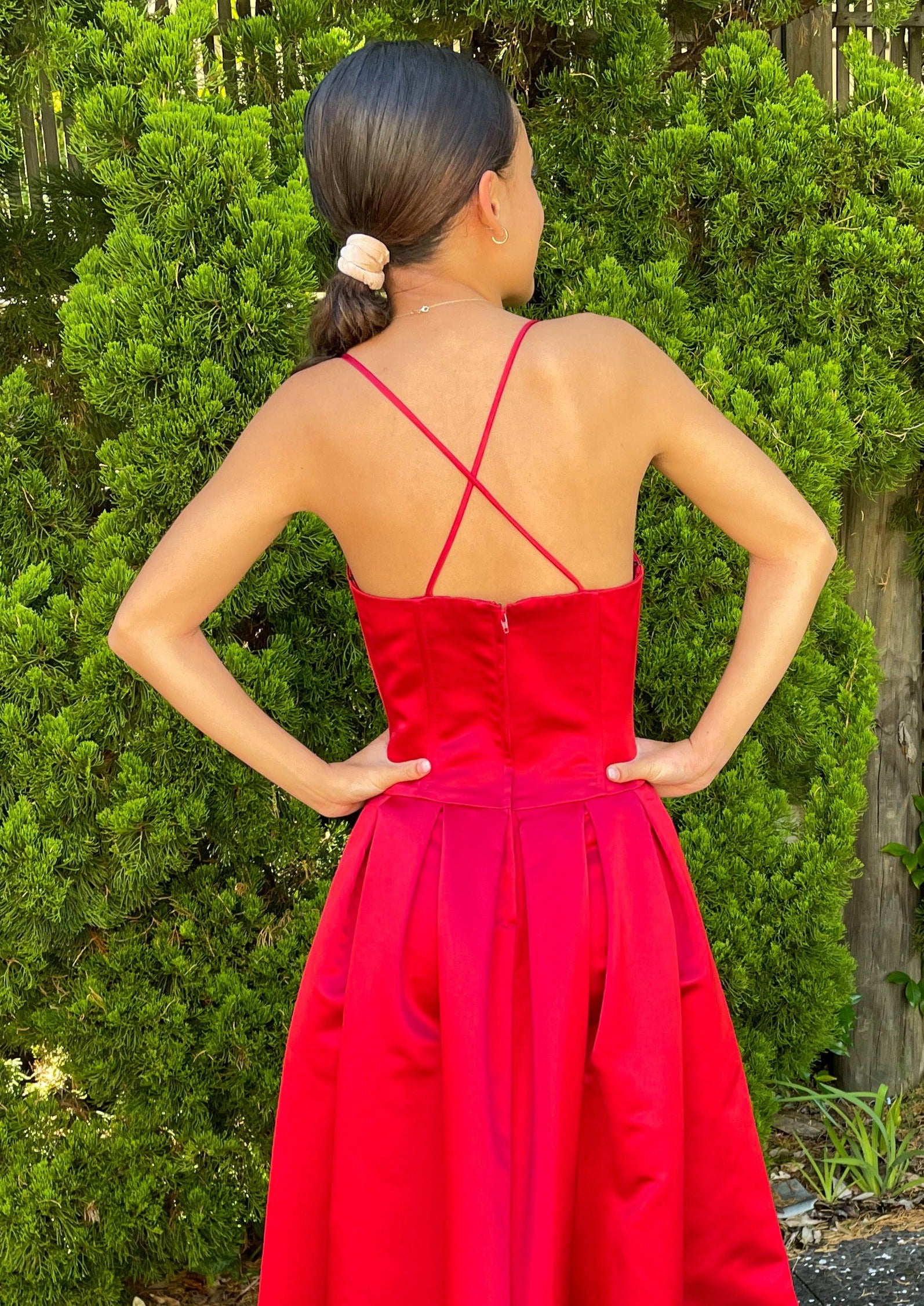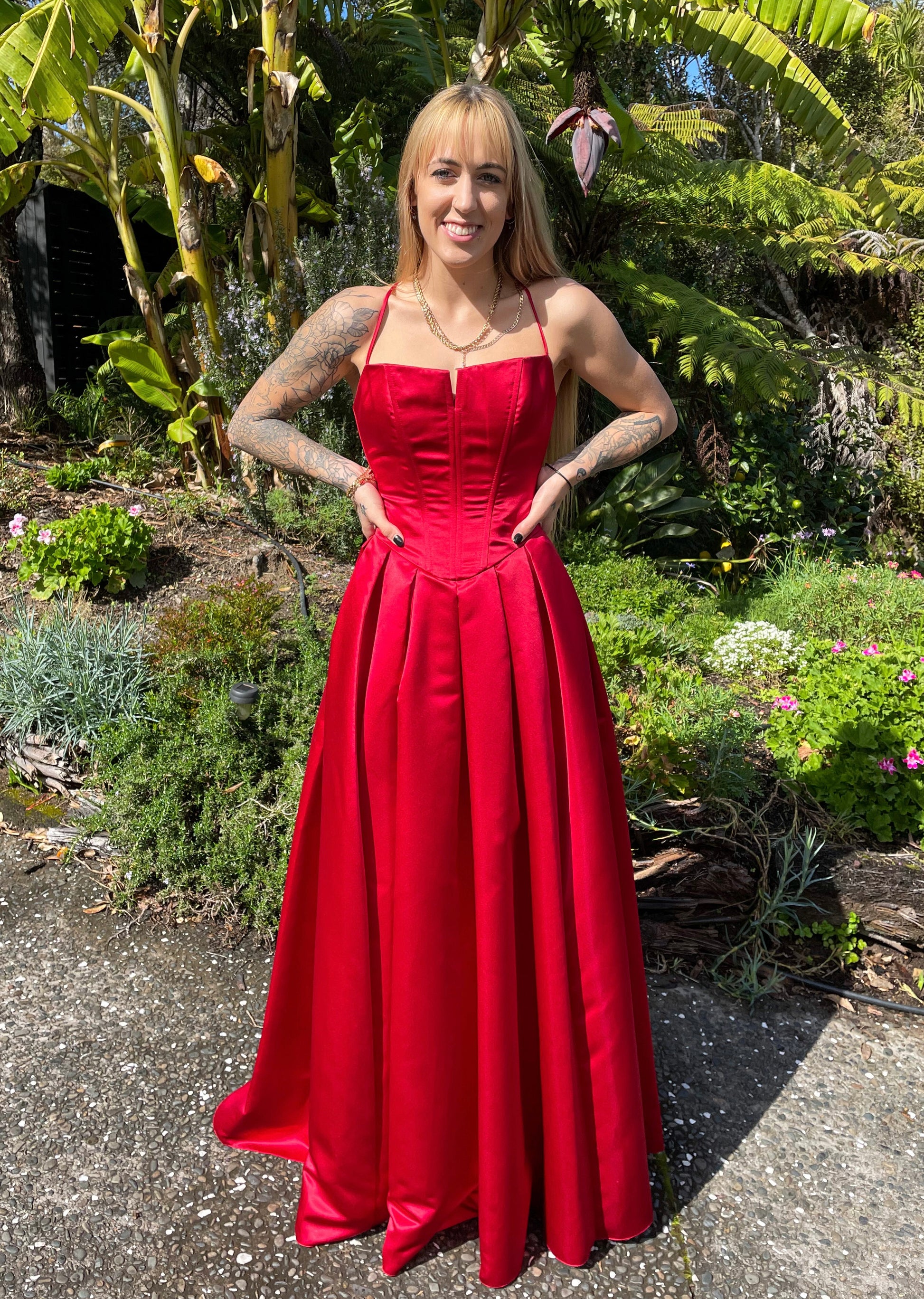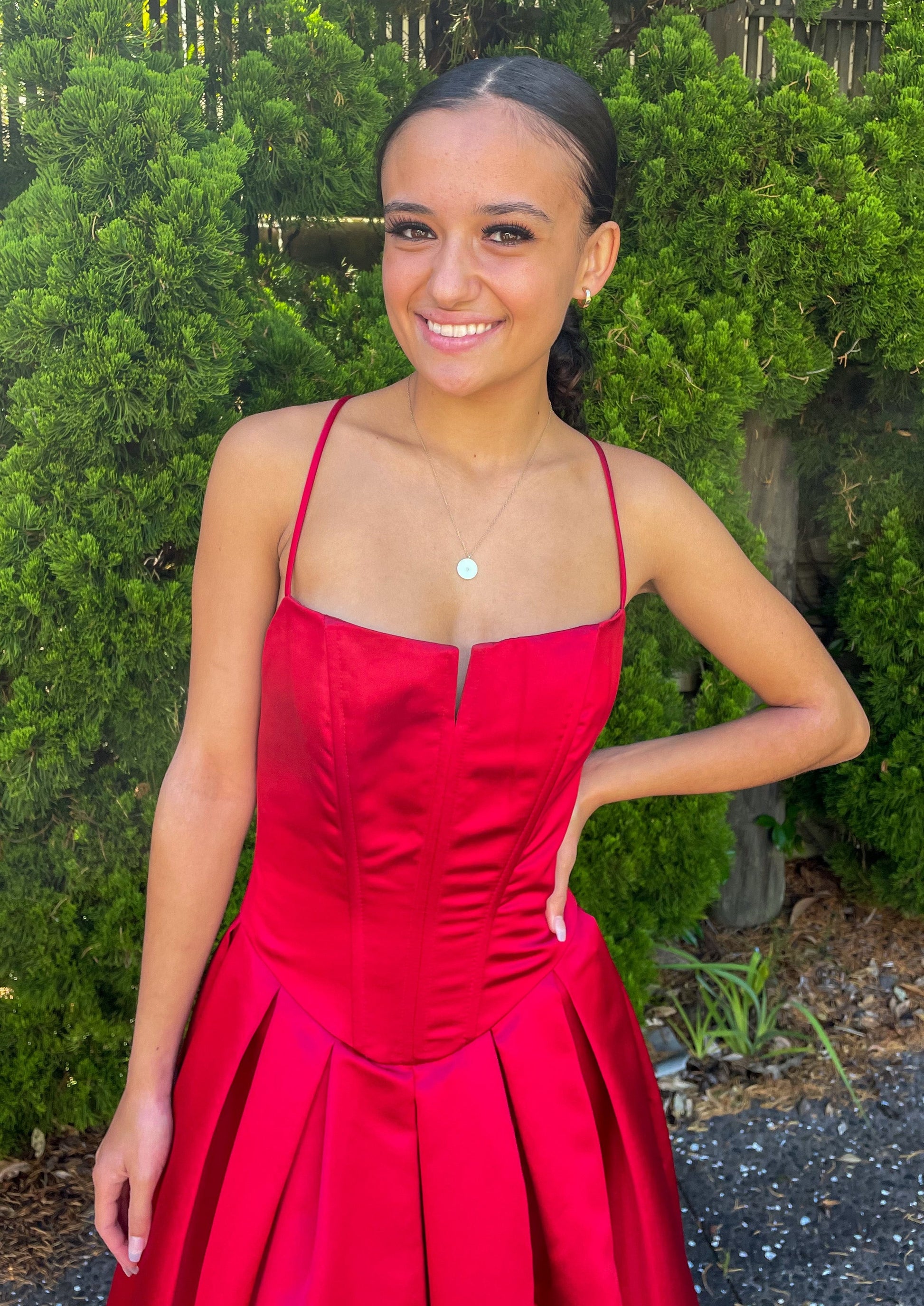 Evoke timeless beauty with this classic red gown. Classic details make it a charming and sophisticated choice for school balls.