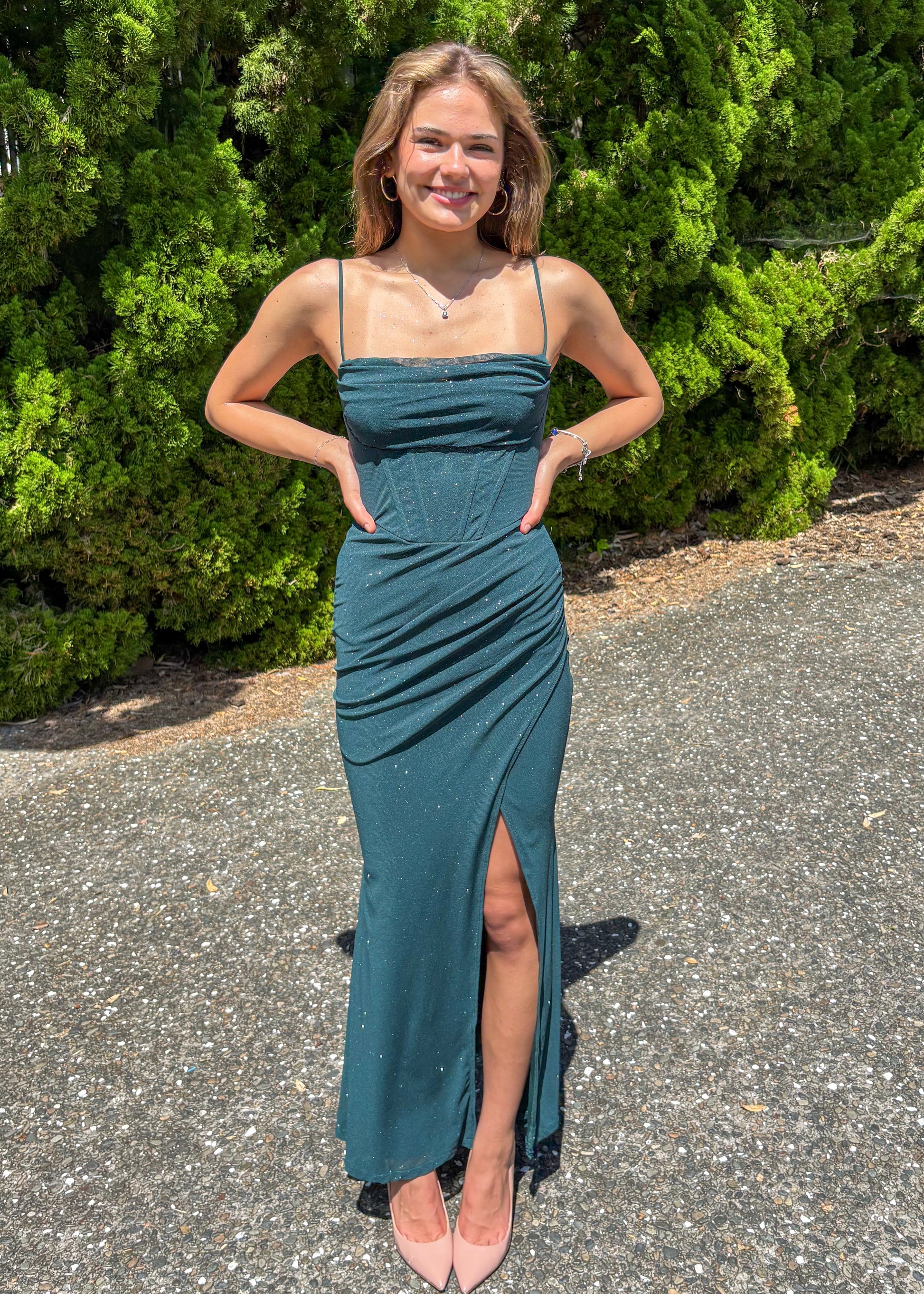 A stunning sparkly emerald green ball dress, featuring a boned corset, sweetheart neckline and a slit. Find out more about our try-on options.