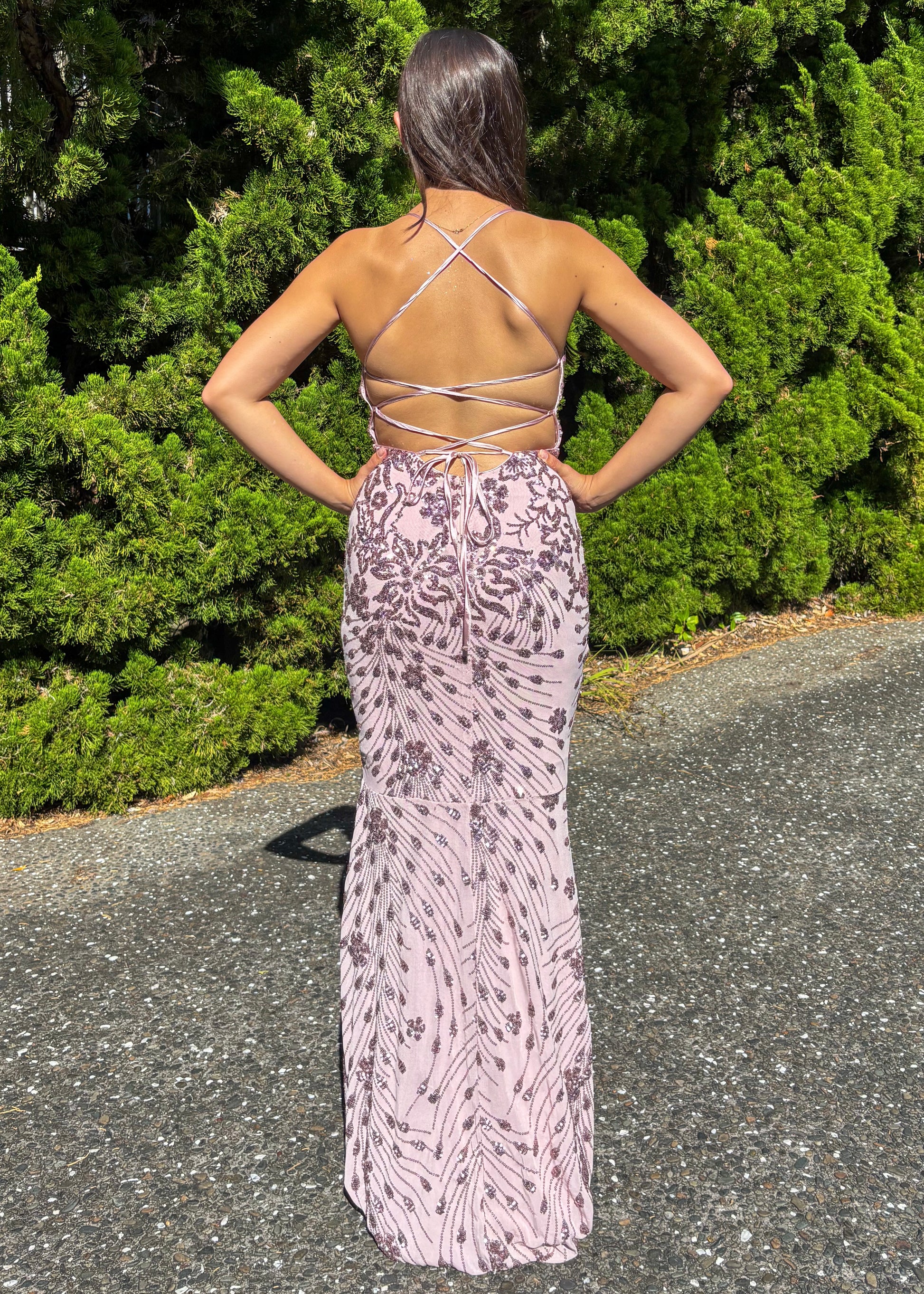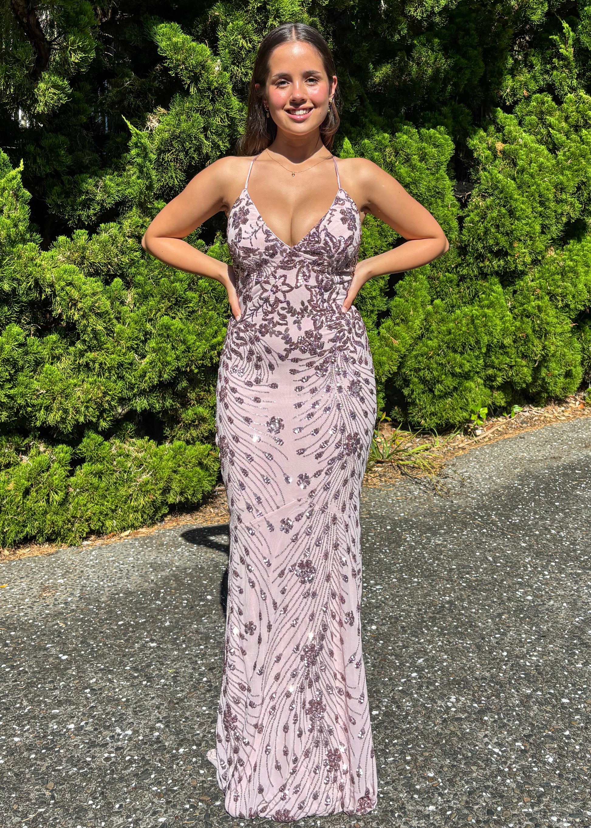 Turn heads in this pink ball dress, showcasing a deep V-neckline and floral sequins, with a lace-up back for a flattering, glamorous look. Find out more about our try-on options.