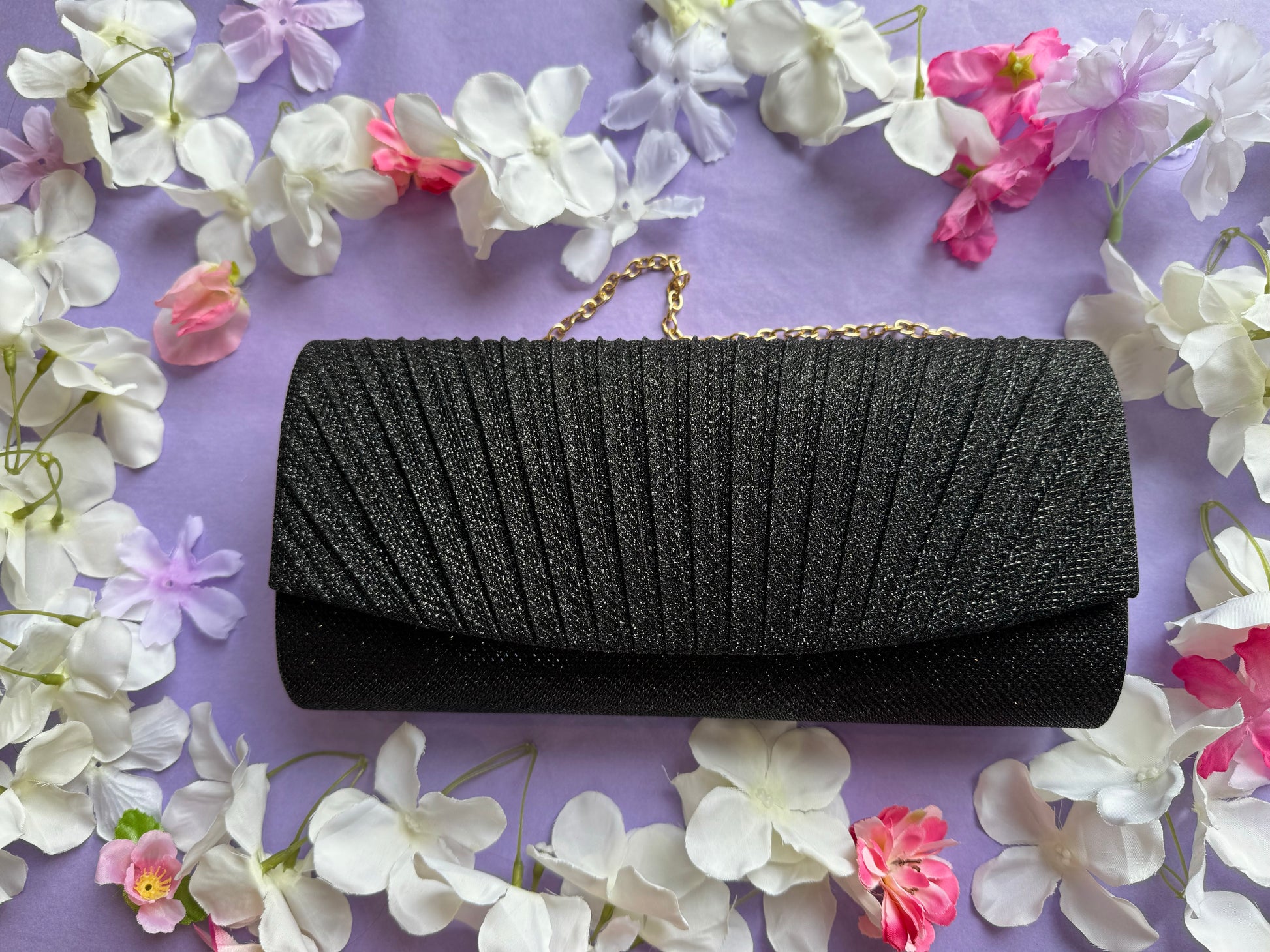 This sparkly black clutch with a gold chain is effortlessly chic and glamorous!