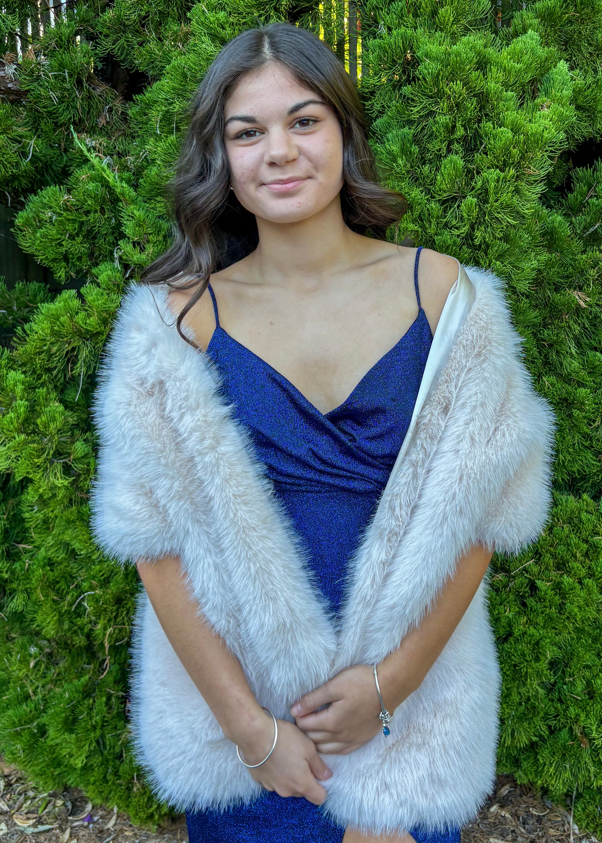 Stay stylish and cozy on chilly evenings with this plush apricot faux fur stole – a timeless accessory for any ball gown.