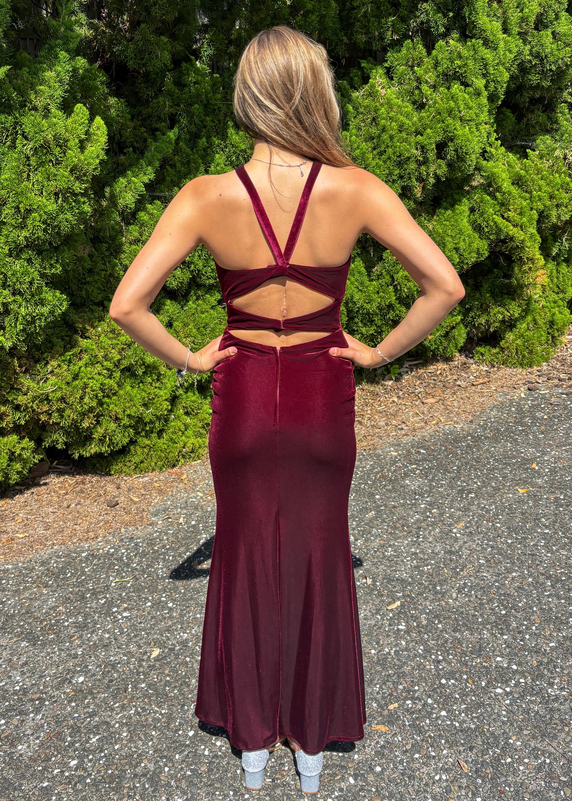 Appreciate contemporary elegance in this sleek and modern red velvet dress. Striking cut-outs lines and luxurious velvet make it a chic and captivating choice.